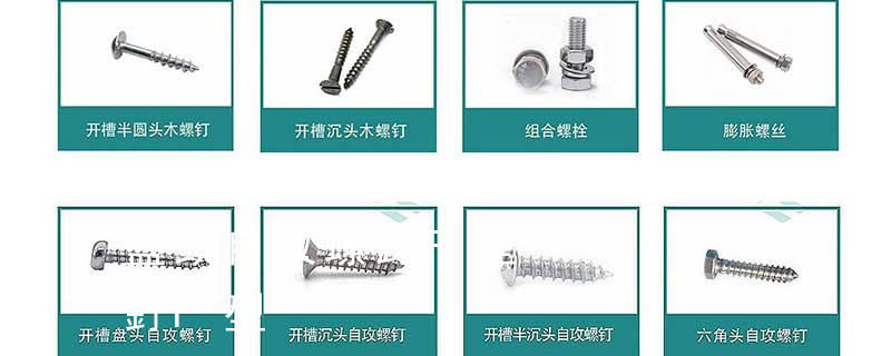 沉頭內六角螺釘(平杯)、半圓頭內六角螺釘(圓杯)、十字槽盤頭機螺釘、十字槽沉頭機螺釘、十字槽大扁頭機螺釘、十字槽盤頭自攻釘、十字槽沉頭自攻釘、十字槽大扁頭自攻釘、全牙絲桿(牙條)、六角螺母、法蘭 自切自攻螺釘有以下幾種型式:十字槽盤頭自切自攻螺釘,十字槽沉頭自切自攻螺釘。十字槽半沉頭自切自攻螺釘,六角頭自切自攻螺釘。3、自擠自攻螺釘(自攻鎖緊螺釘)自擠自攻螺釘的螺紋一般為機螺紋,很少采用自攻螺紋。在扳擰