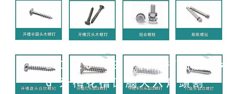 1.機螺釘 2.自攻螺釘 3.鉆尾螺釘 4.墻板釘 5.纖維板釘 6.木螺釘7.六角木螺釘 8.不脫出螺釘 9.組合螺釘 10.微型螺釘 11.家具螺釘 12.電子螺釘頭型:1.六角頭(hexagon head) 2.六角頭法蘭面(hexagon head with flange) 3.